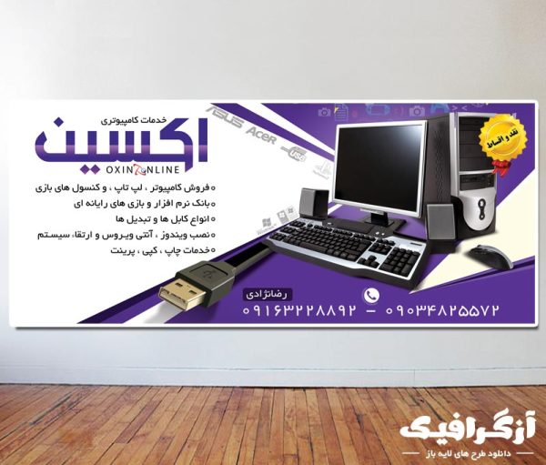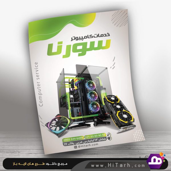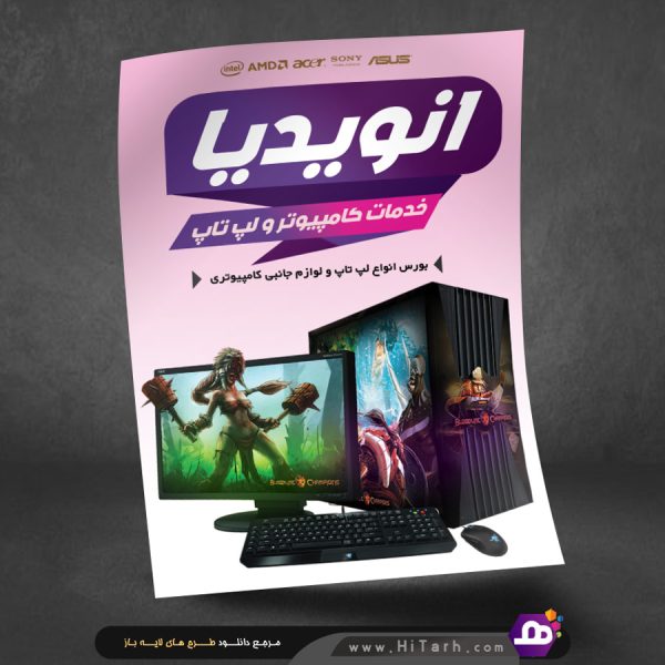 طرح فروش کامپیوتر و لپ تاپ در سایز ۹ در ۶ سانت طراحی شده و در طرح از تصاویر لپ تاپ ، کارت گرافیک و هدفون استفاده شده که تمام تصاویر کیفیت خیلی بالا هستند